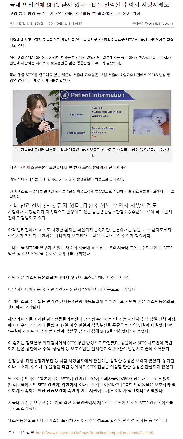 [언론기사] 국내 반려견에 SFTS 환자 있다‥日선 전염된 수의사 사망사례도