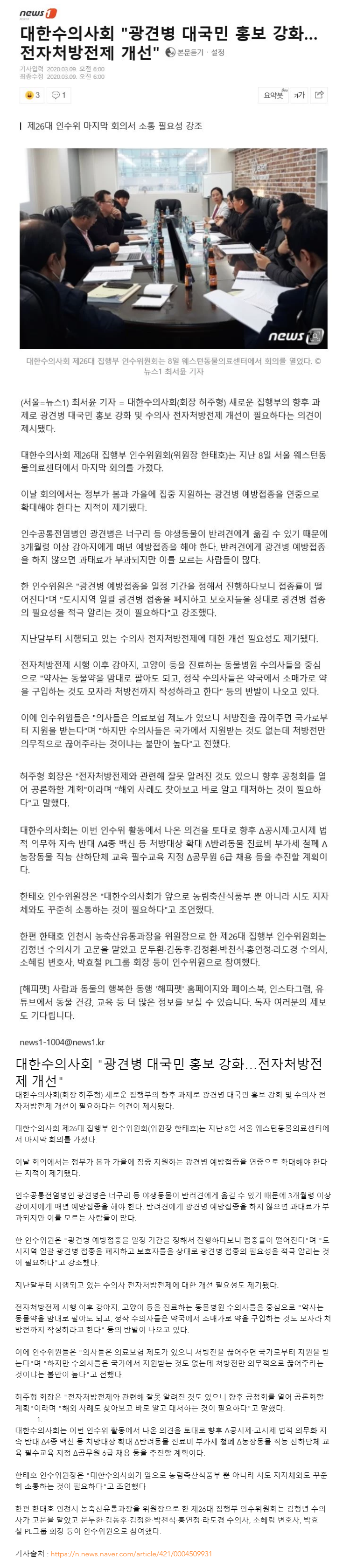 [언론기사] 대한수의사회 광견병 대국민 홍보 강화…전자처방전제 개선