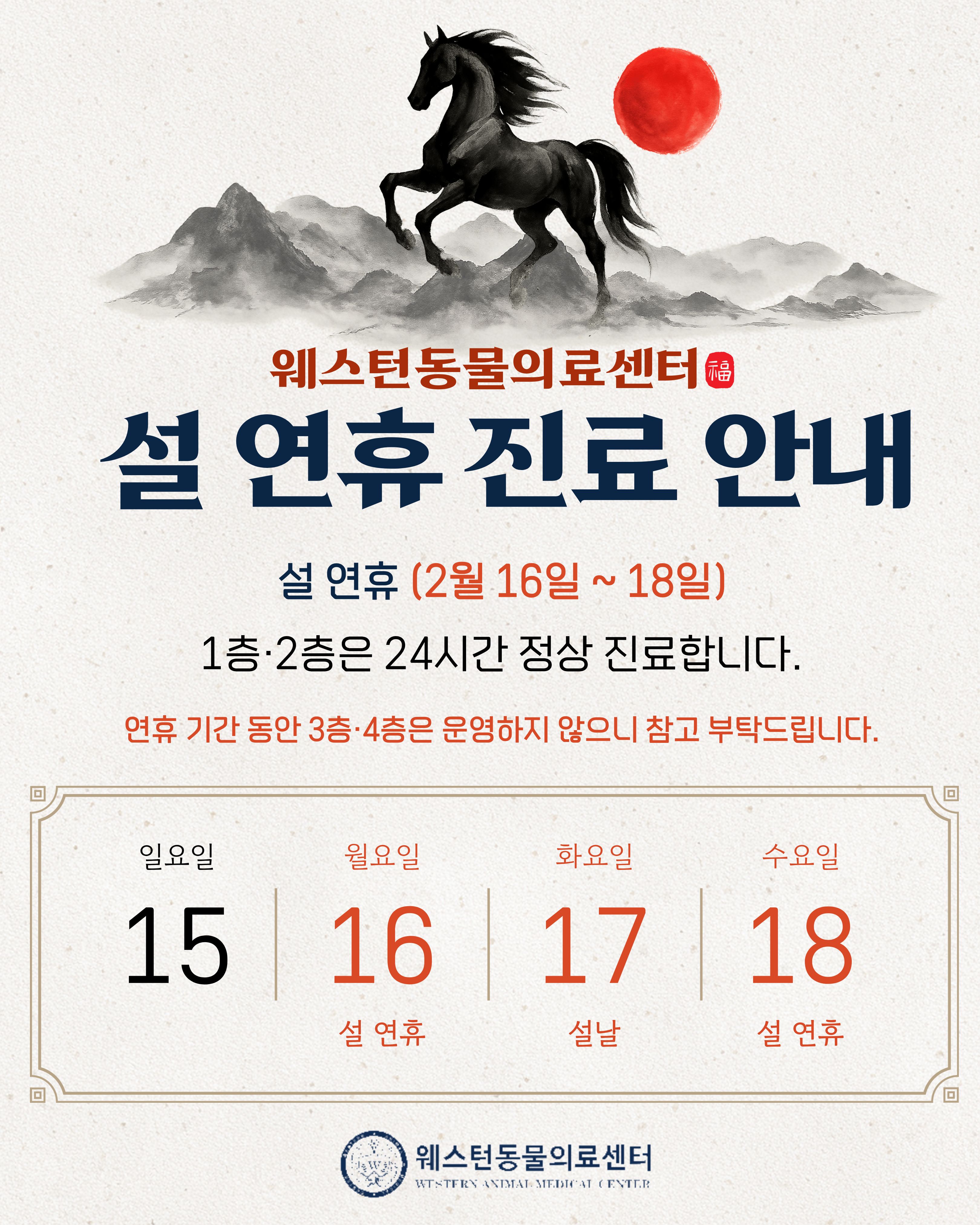 저희 웨스턴동물의료센터는 설연휴기간(1월16일~18일) 동안 쉬는날 없이 정상진료을 진행합니다.